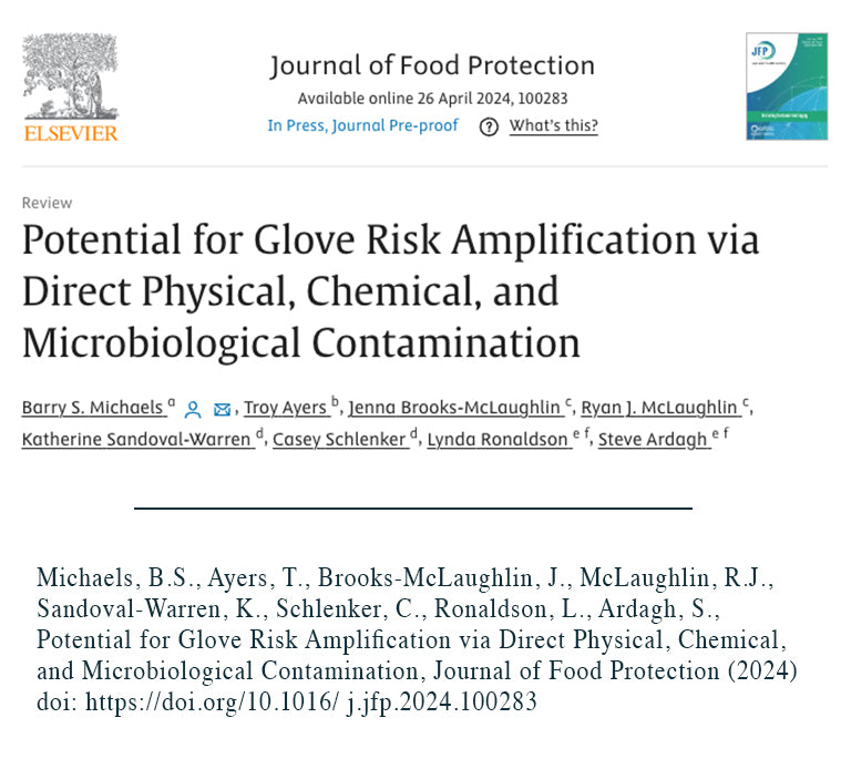In a groundbreaking Journal of Food Protection article*, evidence-based studies of direct physical, chemical and microbiological glove contamination affecting food and healthcare industries, consumers and patients, as well as glove wearers are discussed. It is widely assumed when gloves meet FDA compliance standards they are safe for use and free from chemical and microbial contamination. However, current glove manufacturing standards and testing requirements appear inadequate, allowing for potential contamination and public health issues.